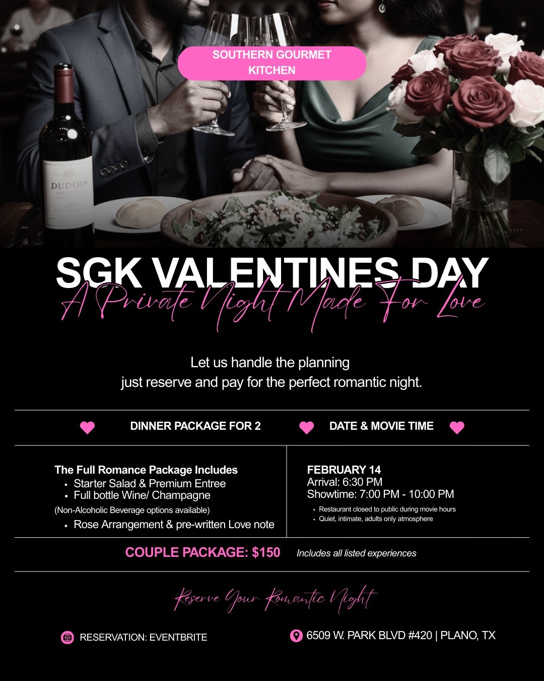 Full dining service and movie with a 4-course meal for two for $150, including champagne or wine. Tickets will be sold exclusively through Eventbrite.